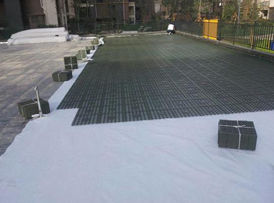 3.排水板上面覆盖土工布,土工布相互搭接10~20cm, 防止泥水穿过土工布,淤堵蓄排水系统,造成排水不畅,蓄水量减少;