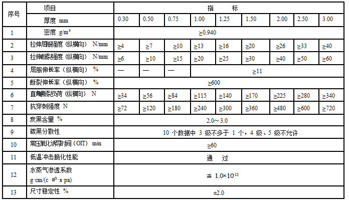 防渗膜标准名称为聚乙烯土工膜,主要是乳白色半透明至不透明的热塑性树脂材料-聚乙烯树脂制作而成。聚乙烯是高分子聚合物,是无毒、无味、无臭的白色颗粒,熔点约为110℃-130℃,相对密度0.918—0.965;防渗膜具有良好的耐热性和耐寒性。化学稳定性好,具有较高的刚性和韧性,机械强度好,耐环境应力开裂与耐撕裂强度性能好,随着密度的上升,机械性能和阻隔性能会相应提高,耐热,和抗拉强度也更高;可耐酸、碱、有机溶剂等腐蚀。